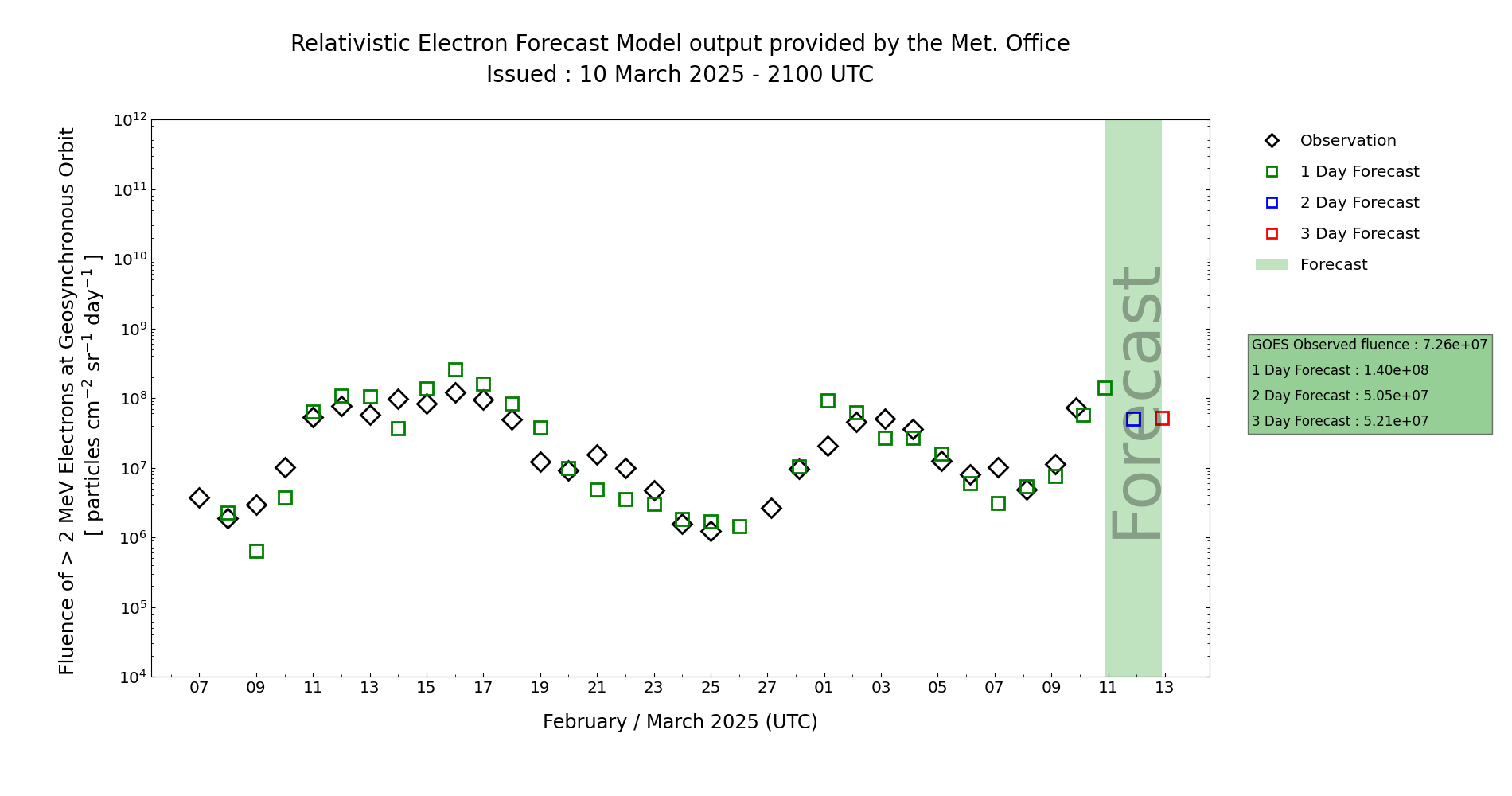 The high-energy electron flux (>2MeV) as observed at GOES16 is forecast to be at mainly background at first, but then rising as solar winds and geomagnetic activity eases from the recent fast wind connection. This will lead to Moderate flux, and an increasing chance of persistent High flux later day 2 (10 Mar). Confidence is low for the longevity of this high flux however due to the potential fast wind onset from CH22/- later on day 4 (12 Mar), providing the potential for drop out of the observed flux at GEO.