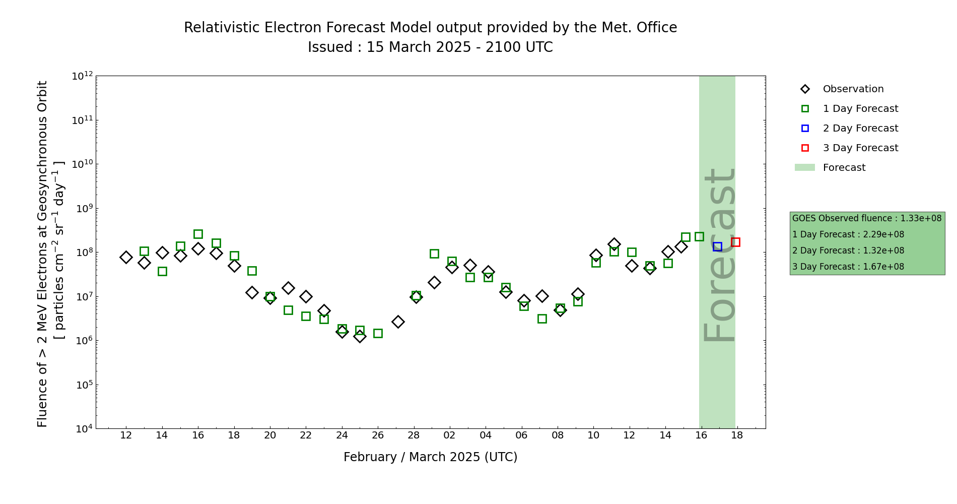 Overall the fluence is currently rising, and is now very close to Active, and is expected to rise above Active during Days 1-2 (15-16 Mar). Confidence then decreases during Days 3-4 (17-18 Mar) due to the uncertainty regarding the next HSS arrival. MOSWOC REFM is suggesting that fluence will remain above Active during the next 3 days, which seems like reasonable guidance at the present time, although perhaps with overall values slightly too high.