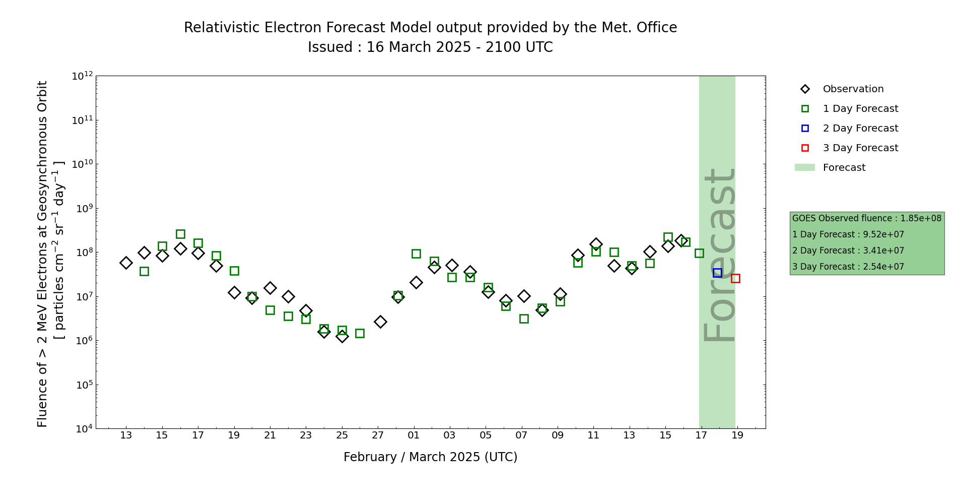 The associated 24 hour fluence is expected to continue at Active day 1-2 (16-17 Mar), but with confidence for this to persist days 3-4 (18-19 Mar) falling. This is supported by 27-day recurrence. MOSWOC REFM is currently overestimating the observed flux, and subsequently the forecast values from this model are also likely over-estimated.