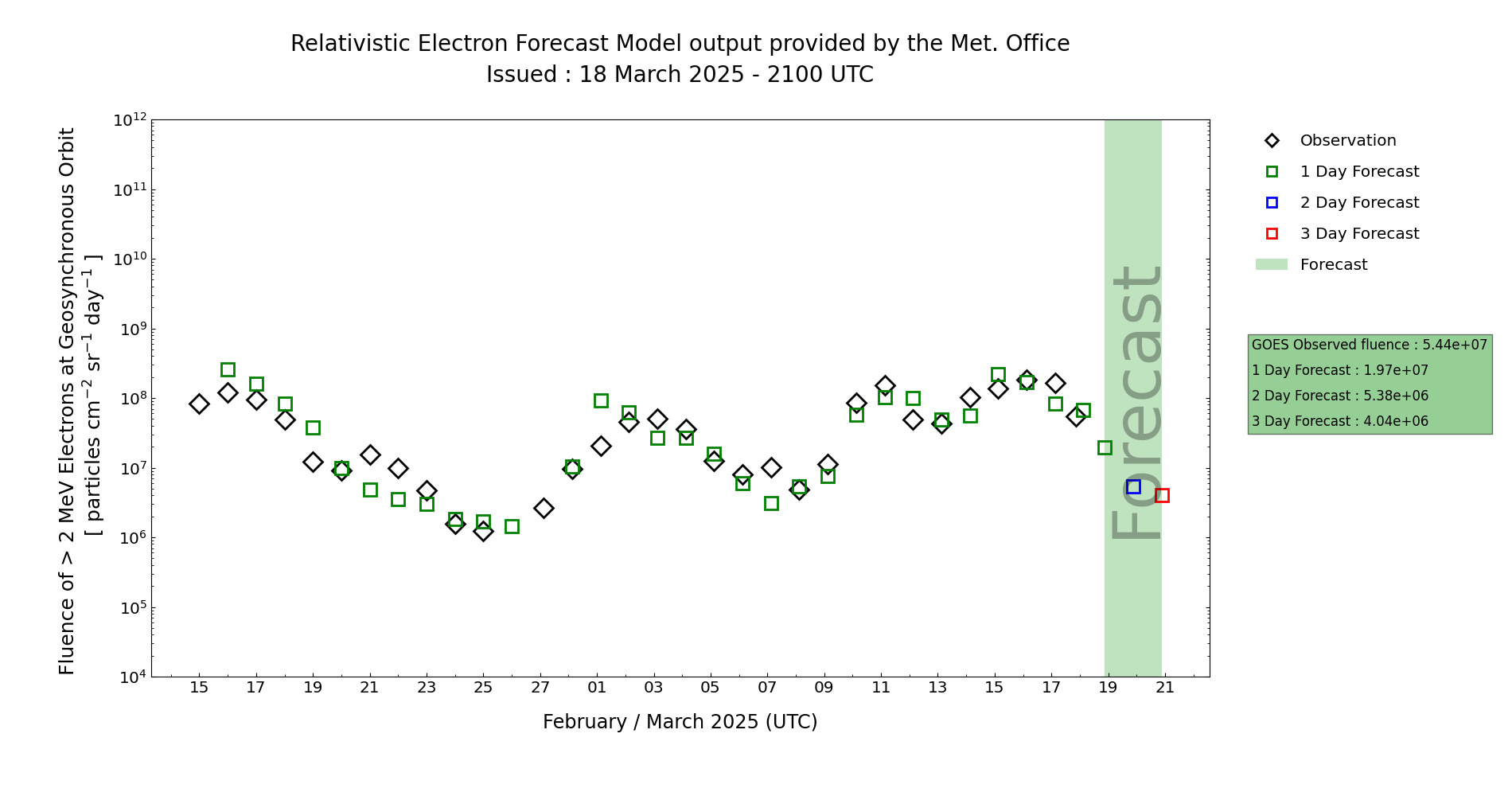 The associated 24 hour fluence is expected to continue above Active (1e8 integrated pfu) at first, but with lower confidence for this to persist into Days 3-4 (19-20 Mar). A declining trend is supported by both 27 day persistence and MOSWOC REFM, with observations currently lying between these two models, however these do not take account of any further enhancement that may occur from a possible glancing CME (19-20 Mar), and are also currently showing a declining trend, while observations are rising. This lowers confidence in this forecast.