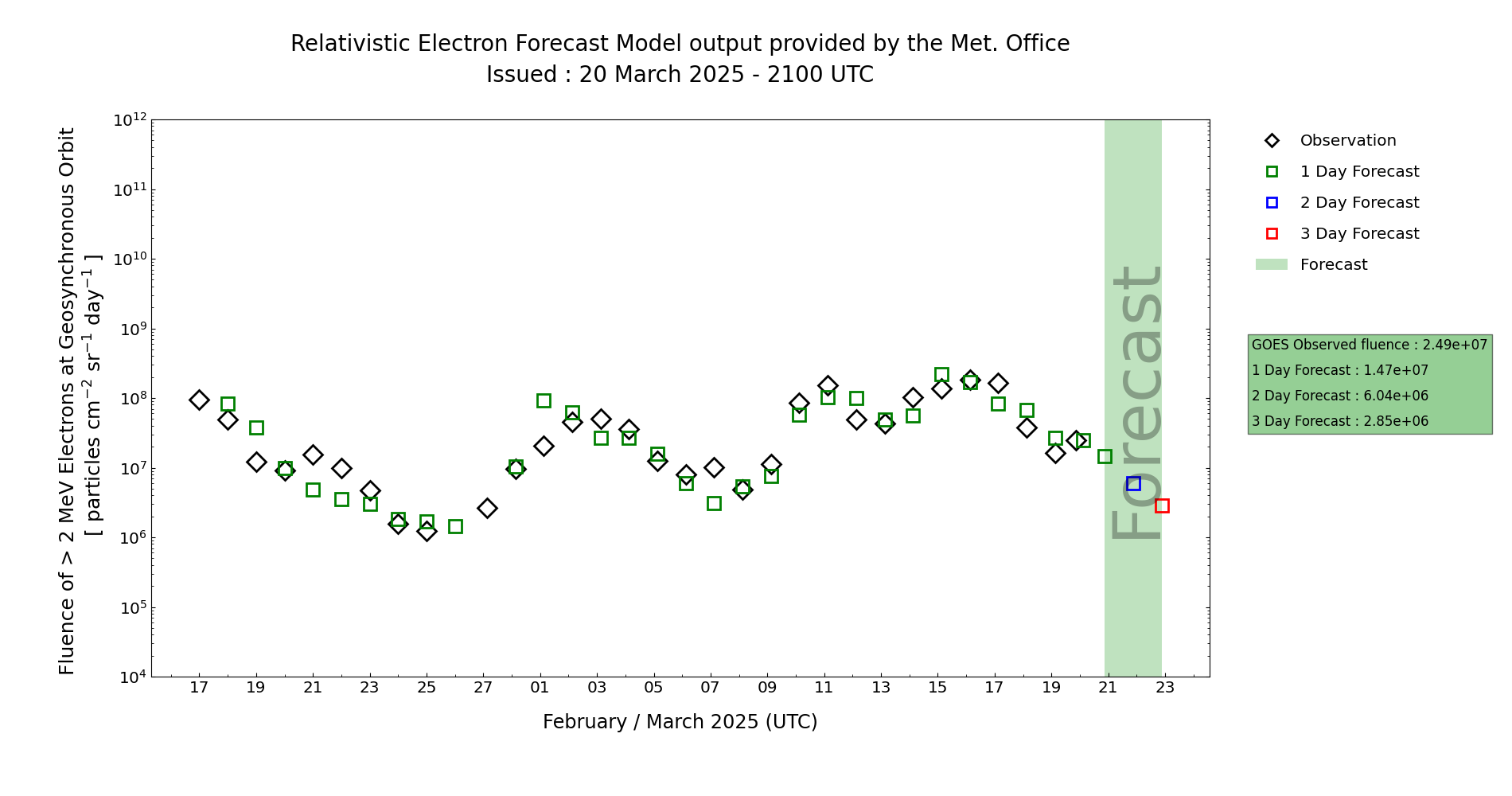 GOES16 High energy (>2MeV) Electron flux has fallen from diurnally high levels over recent days down close to background. With possible CME arrivals expected over the next few days (19-21 Mar), this may serve to clear some electrons from their orbits, keeping flux at background to moderate levels, although prior to, or in the absence of, any CME arrivals electron flux could return to high levels. Confidence is therefore low due to these uncertainties in the CME forecast.