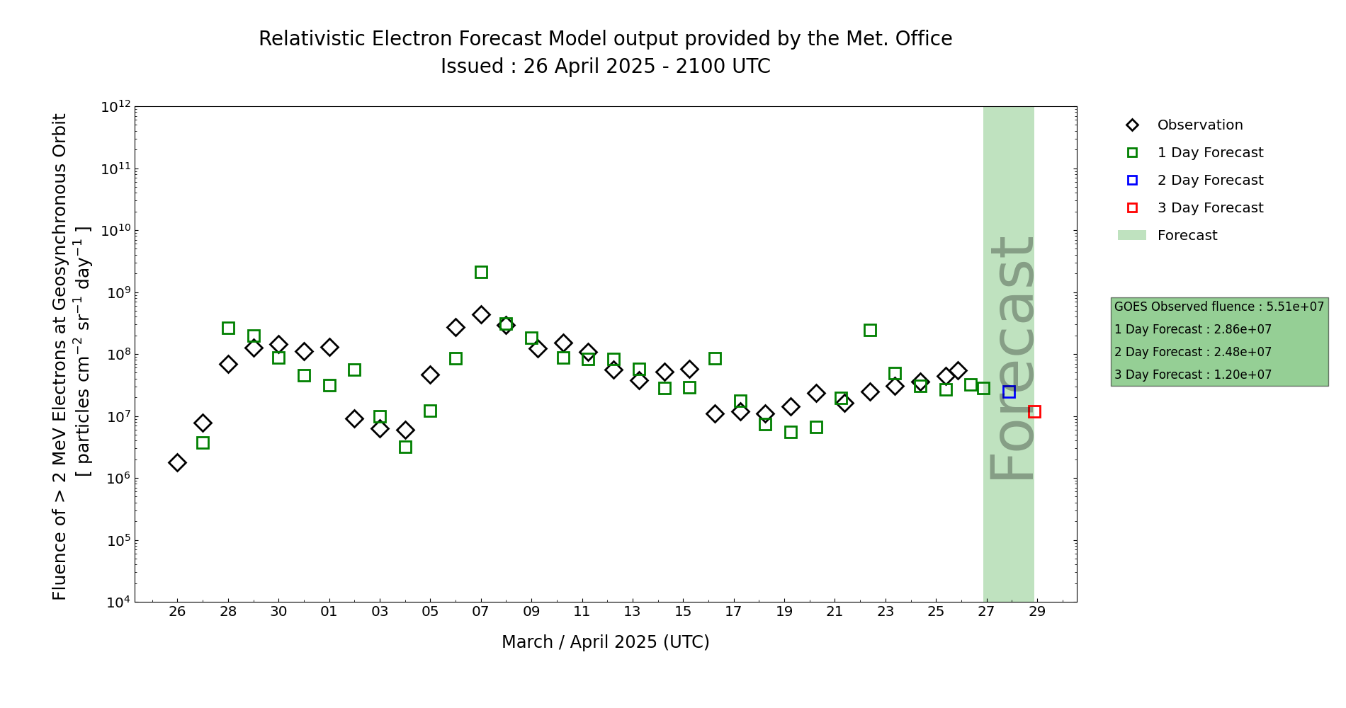 High energy electron flux (greater than 2MeV) has been at mostly Moderate levels during the last 24 hours. The recent HSS likely increased electron flux at altitudes below GEO, and the arrival of the CME earlier on 24 April may also have helped to suppress the electron flux at GEO further. Any further increases in electron counts at GEO now look increasingly overdue however, and the chances of Active fluence have been adjusted downwards in the near-term - a trend that is now also showing in the latest MOSWOC REFM output.