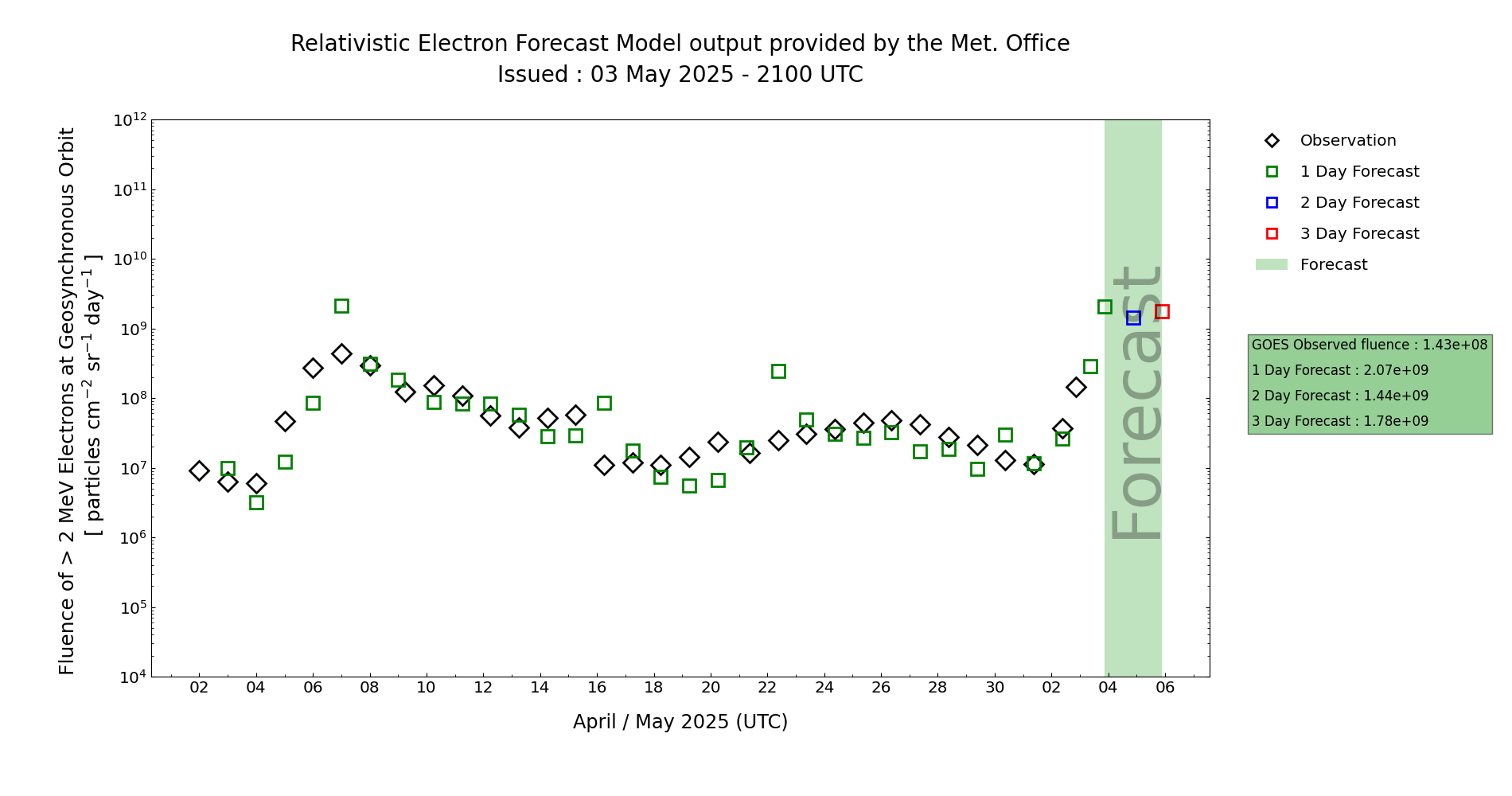 The associated 24 hour fluence is currently forecast to remain below the Active level at first, but with an increasing chance of breaching the Active threshold from Day 3 (05 May) onwards.
