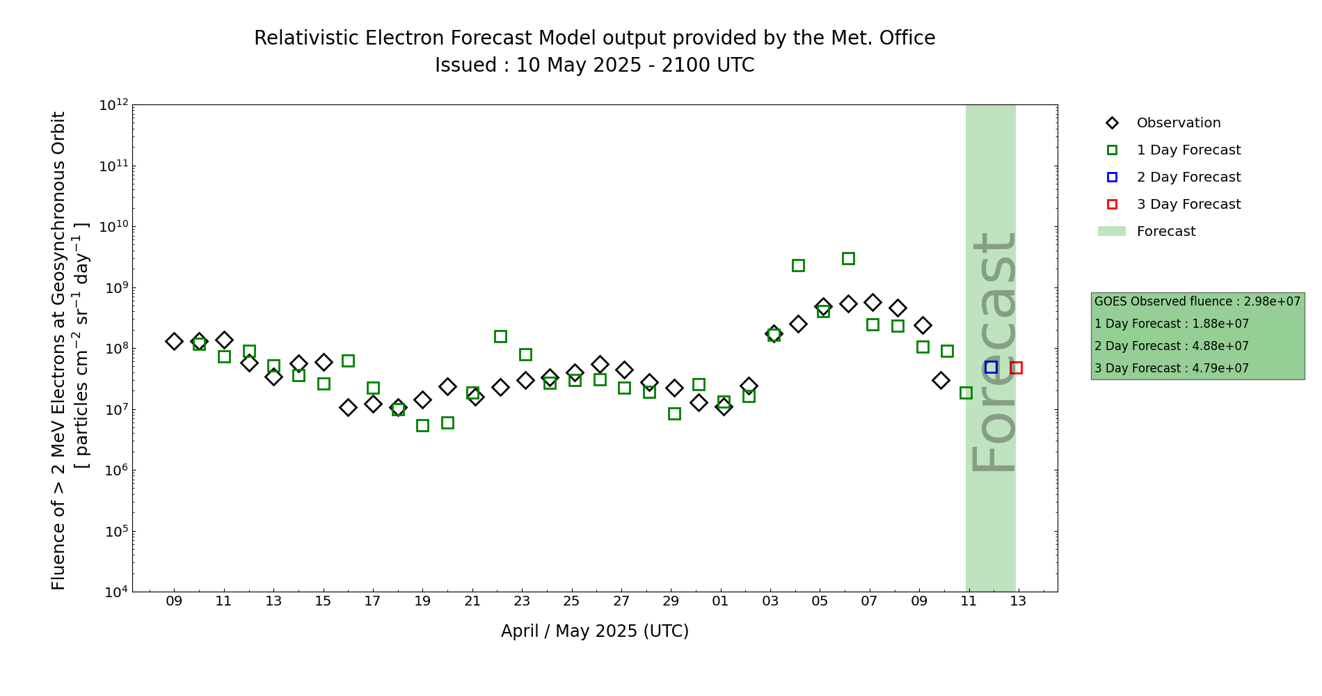 The associated fluence is expected to persist at Active on day 1 (10 May) with a chance of this continuing into day 2 (11 May). However, confidence is then low for this to continue beyond this date, likely easing below the Active level. This is supported by persistence, and also by REFM which shows a gradual declining trend, however REFM does not account for any subsequent enhancement from potential fast wind onset on day 1 (10 May).