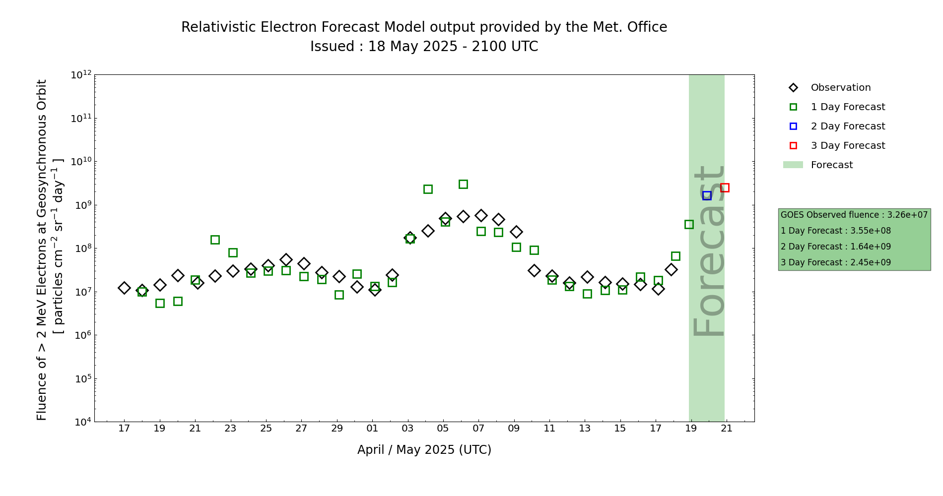High energy electron flux appears to be in a steady state, showing very low values since the arrival of a CME's glancing blow earlier on 17 May. This has since been followed by the early connection to the HSS originating from CH48/+, which has seen solar winds rising significantly. This is likely to suppress the electron flux during day 1, at leas temporarily, and maintain it at Background levels. However, the Van Allen radiation belts should soon replenish and an increase in electron flux is likely to manifest itself at GEO towards the end of the guidance period, with the likelihood of breaching diurnally high flux levels by around Day 4 (21 May). A similar rise was observed during the last rotation but the High level was never attained.