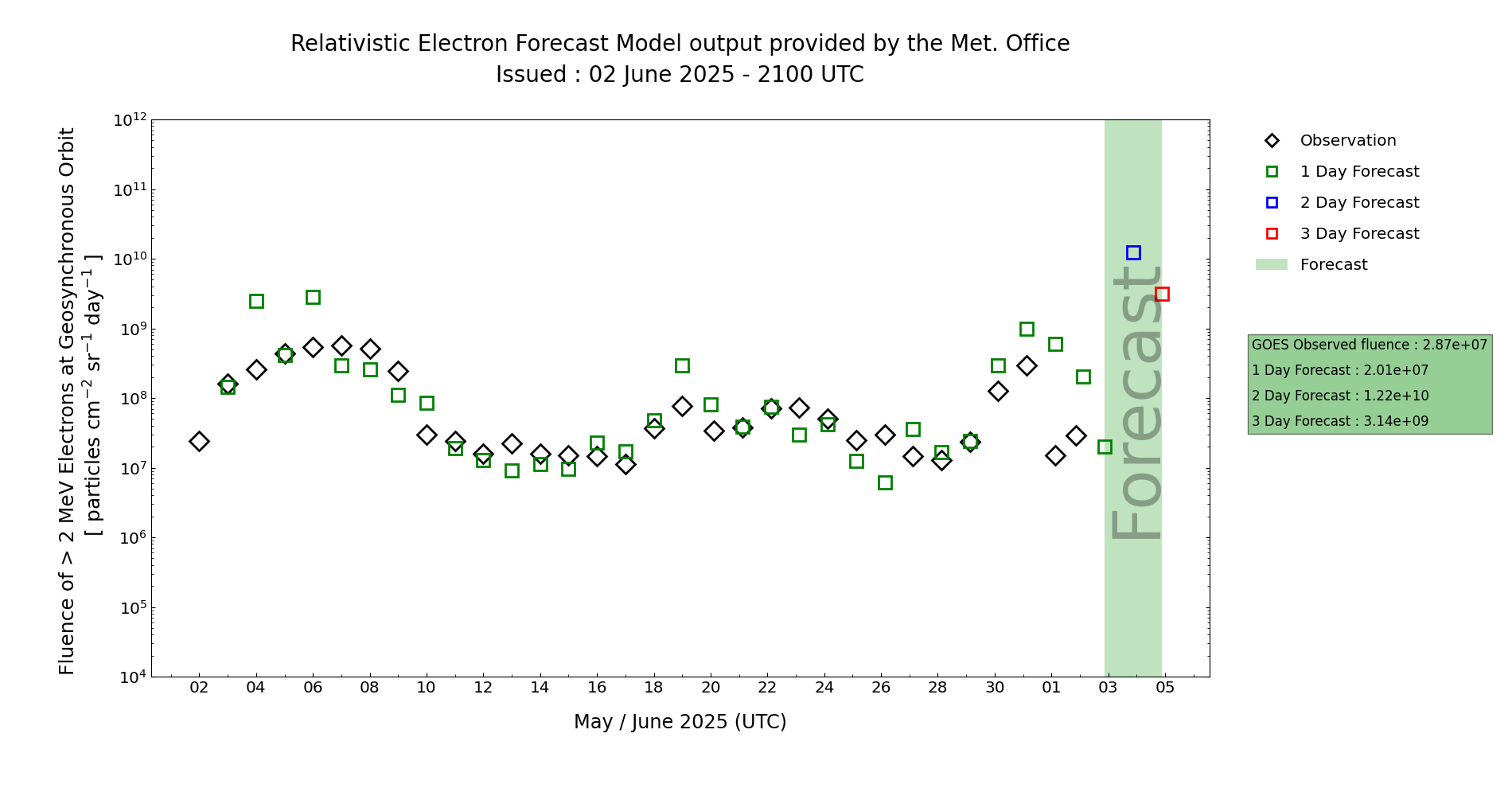 The associated 24-hour electron fluence has also fallen below the "Active" threshold and is expected to remain at this level through Day 1 (02 Jun) and Day 2 (03 Jun) at least . It may recover from Day 3 (04 Jun) onwards but confidence is low since it hinges entirely on the duration of the magnetic cloud associated with the CME. Additionally, the MOSWOC REFM model is expected to overestimate electron flux, as it does not account for the CME influence, and so will not be useful as a forecasting tool.