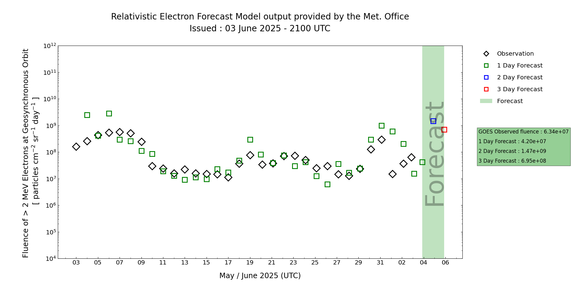 Electron flux unexpectedly rose to High levels on 2 June before returning to background levels. As geomagnetic activity wanes high energy electron flux at GEO should recover, although the magnitude to which this occurs is uncertain - in the wake of the CME. Overall, there is considered a Chance of Active electron fluence being reached over the 4 day period.
