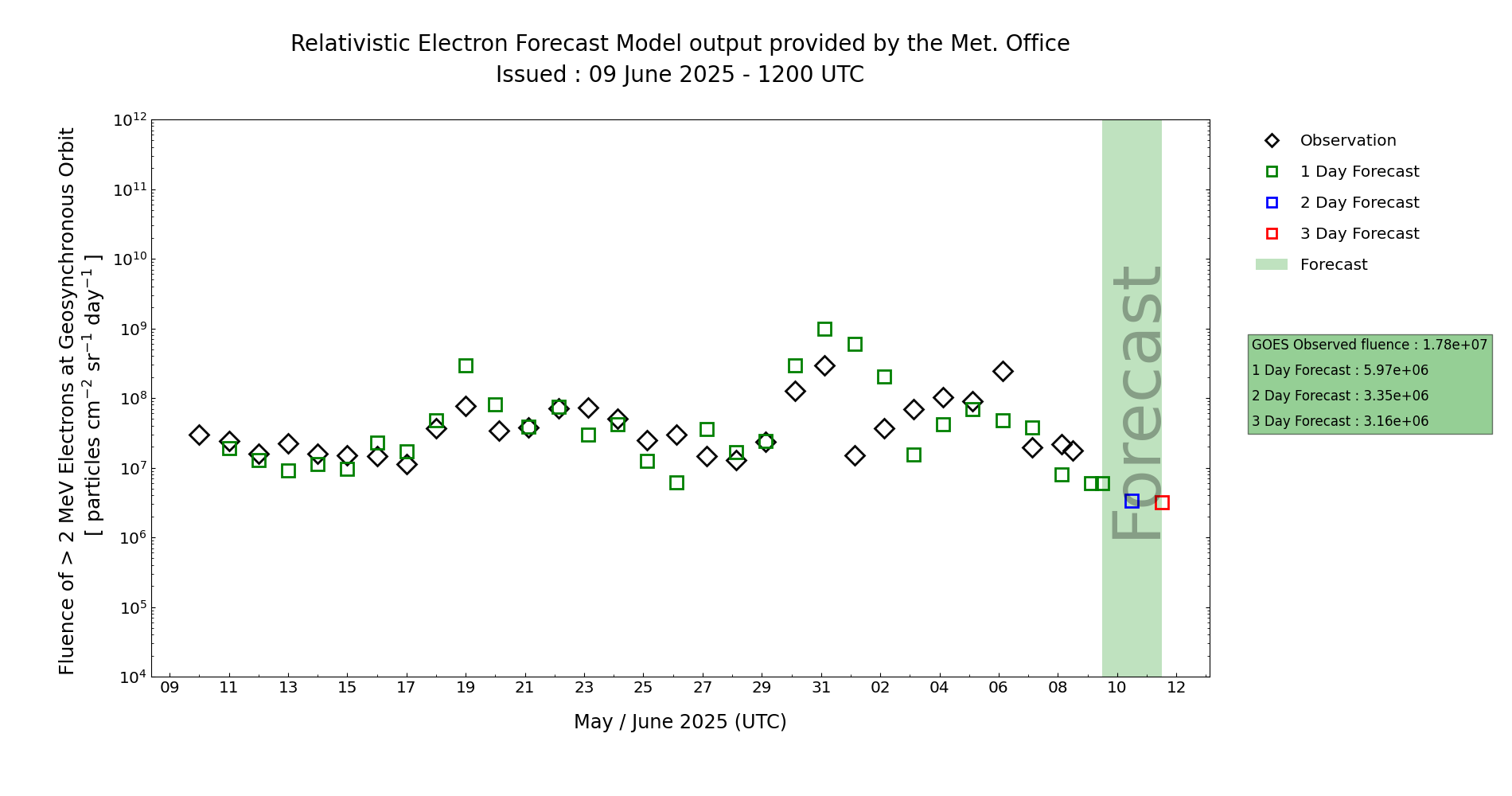 The greater than 2MeV electron flux observed at GEO by GOES19 has proven volatile through a wide range of values since the beginning of June. Confidence in the forecast is now low for the period as a whole - a trait inherited from the geomagnetic forecast and it being dominated by marginal CME influence. While the 01 June CME strongly charged the Van Allen belts, it is now very unclear as to the degree to which these counts survive inside GEO, with some losses expected in the subsequent CME activity from 06 June onwards. Further multiple inbound events will very likely make for volatile electron counts at GOES in the four days, with the chances of Active 24-hour fluence reduced relative to recent guidance given their new lower level and the expectation that this is regularly interrupted. MOSWOC REFM is not considered good guidance in the period given the forecast's reliance on transient rather than coronal hole-derived activity.