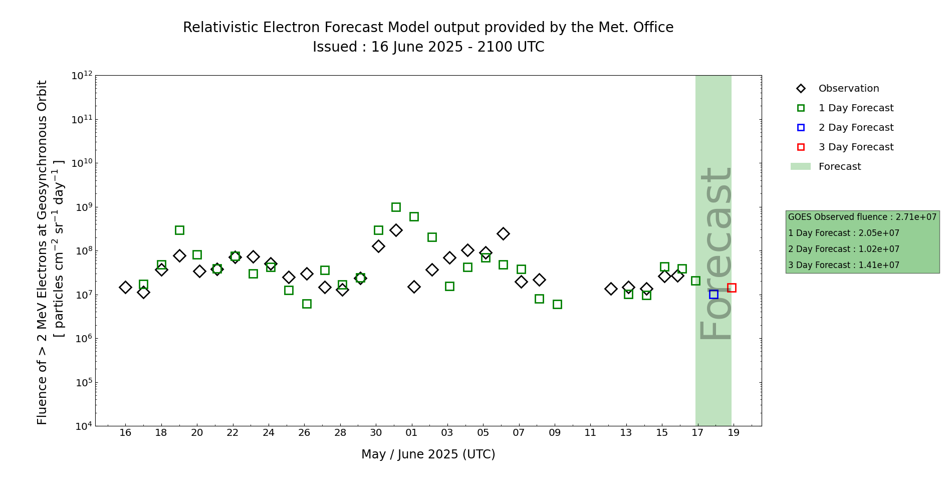 The greater than 2MeV electron flux observed at GEO by GOES19 has been at mostly moderate levels. With the arrival of the HSS from CH57/+, a large southern hemisphere coronal hole, wind speeds may become elevated to strong, which could cause an increase in electron flux below GEO. As the HSS wanes through Day 1 (16 Jun), an increase in high energy electron flux is then possible, with an increasing potential for the electron flux to reach high levels from Day 2 (17 Jun). A possible resurgence of the HSS later Day 2 into Day 3 (17-18 Jun) may see electron flux suppressed again below GEO, before responding again on Day 4 (19 Jun).