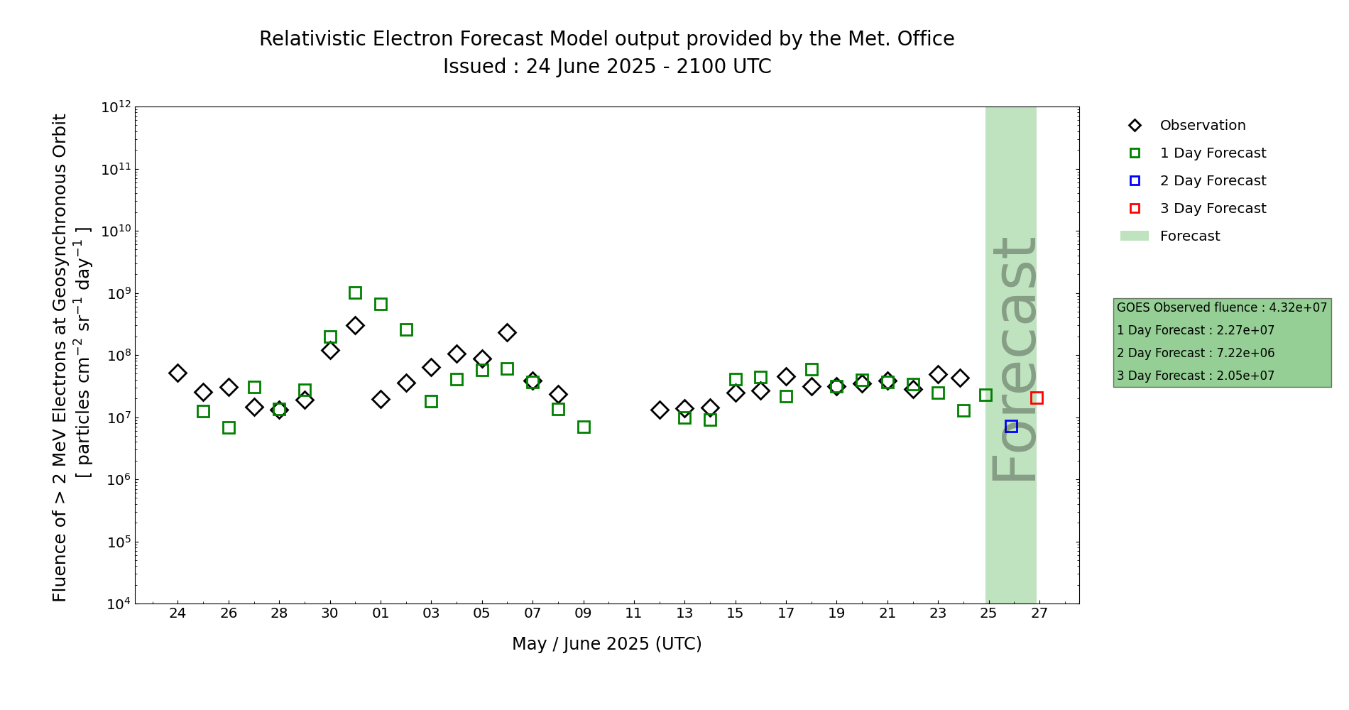 Overall, the associated 24-hour fluence has a very slight chance of reaching the Active threshold on Day 1 (24 Jun), but thereafter is likely to remain below the Active threshold, perhaps with a rising trend from Day 4 (27 Jun). The MOSWOC REFM forecasts generally supports this idea.