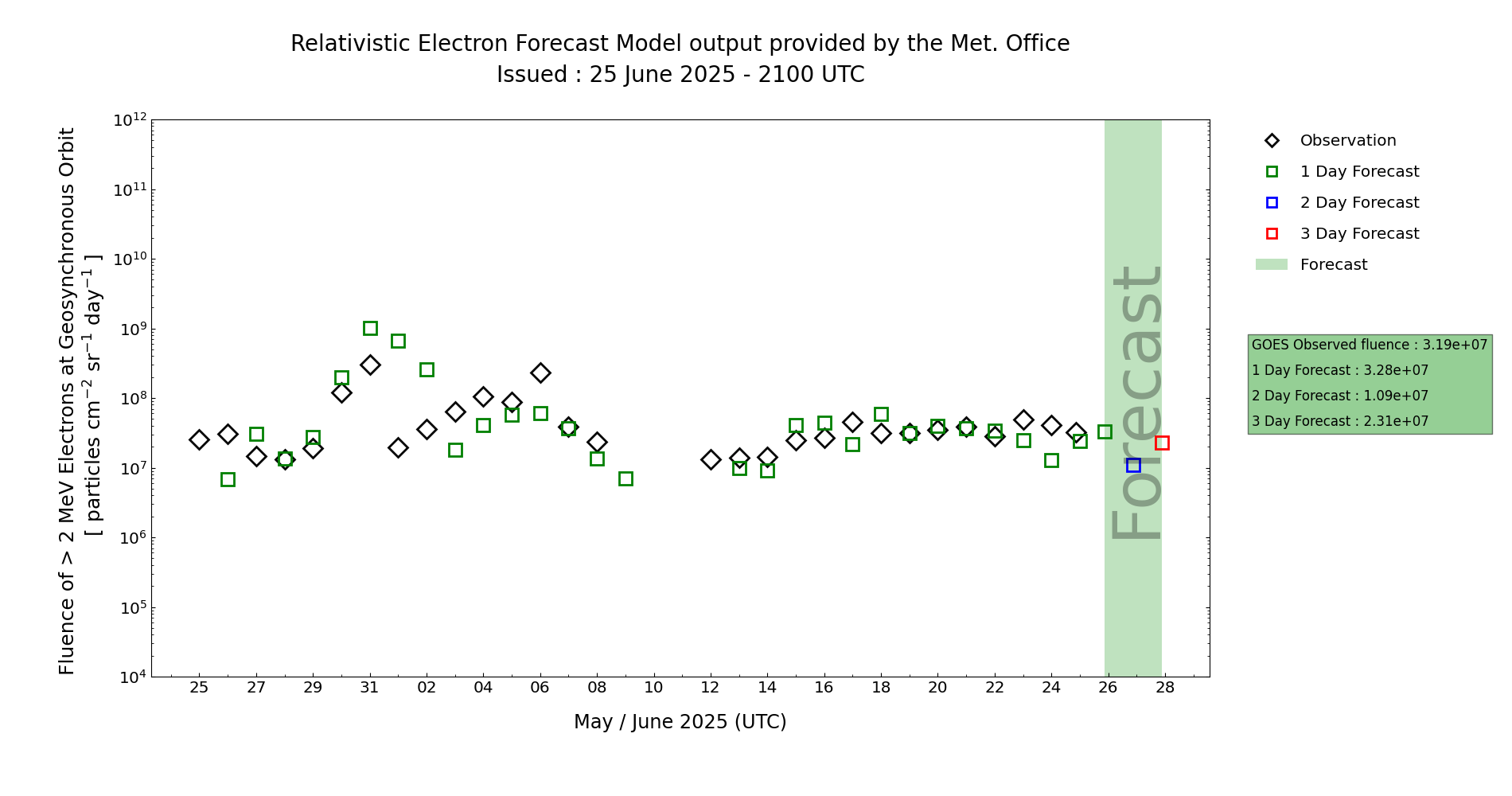 Overall, the associated 24-hour fluence is expected to remain below the Active threshold on Days 1 and 2. A rising trend should follow from Day 3 (27 June), with a chance of exceeding the Active threshold on Day 4 (28 June). This outlook is generally supported by the MOSWOC REFM forecasts.