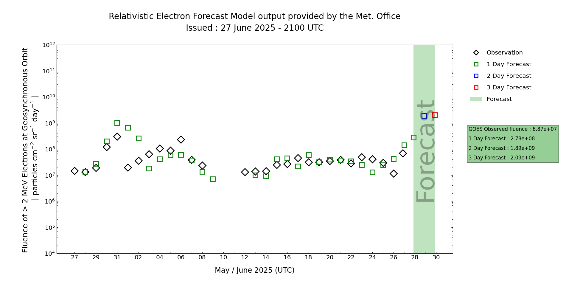 High-energy (≥2 MeV) electron flux observed by GOES-19 has been at background to moderate levels following the onset of fast winds from CH60/-. These ongoing fast winds are likely to result in the charging of the Van Allen belts and as the solar wind pressure gradually eases from today (27 Jun), this enhanced flux is expected to expand outwards towards GEO. This is likely to bring Moderate to High flux levels later Day 2 (28 Jun), and perhaps persistently High flux from Day 3 (29 Jun).