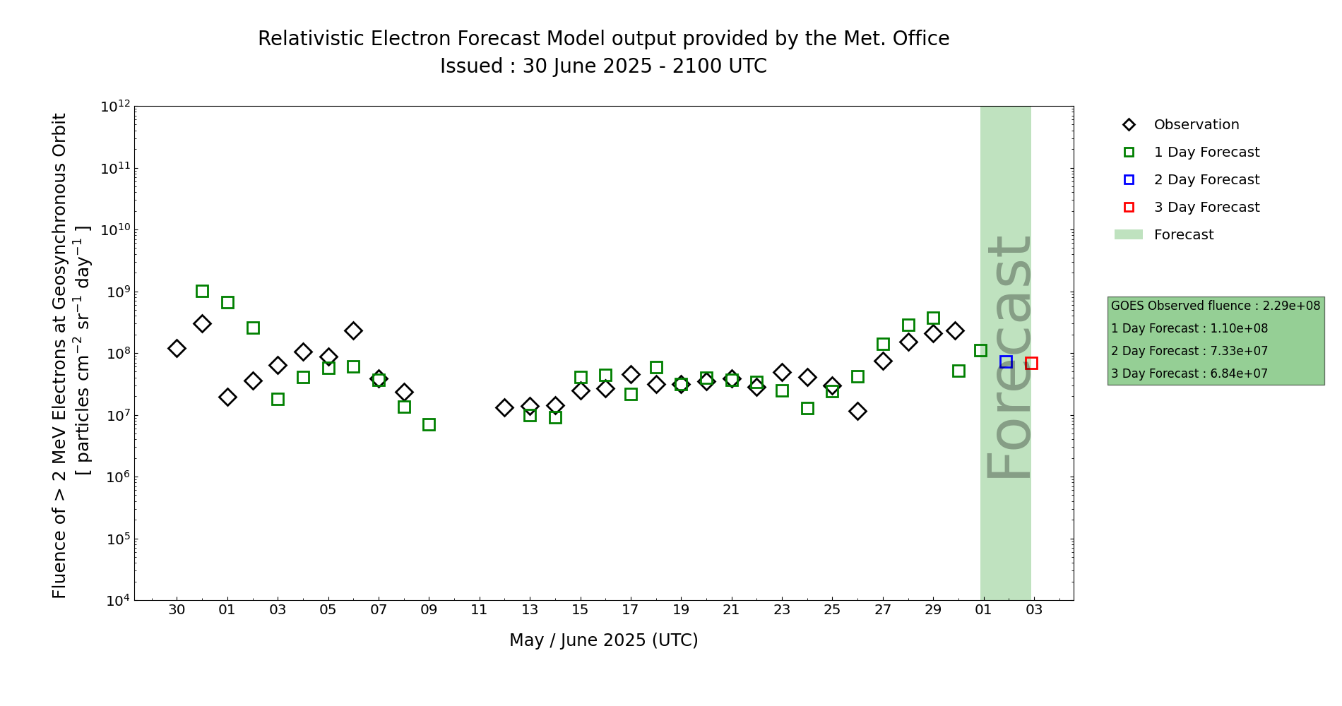 MOSWOC REFM has been over-forecasting fluence levels over the past 48 hours, likely due to CME pollution on the previous rotation and later arrival of the fast winds of CH59/- and CH60/-, however the general trend has been relatively representative. Fluence is expected to remain above the Active threshold at least through Day 1 (30 Jun). Beyond this, confidence lowers in the evolution, with the risk of Active fluence lowering to a Chance for Days 2-3 (01-02 Jul) with geomagnetic activity expected to increase once again.