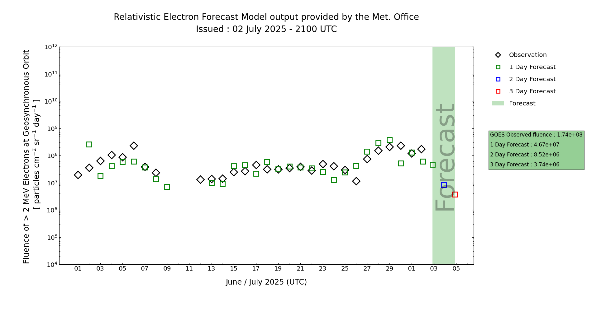 MOSWOC REFM isn't currently providing a useful steer for the electron fluence forecast, likely due to lingering CME contamination from the previous solar rotation. Fluence is expected to remain at or just above the Active threshold, at least through the start of Day 1 (02 Jul). With electron flux expected to fall (as mentioned above), fluence is also expected to fall, likely dropping below the Active threshold level. A rise in fluence towards the end of the period is possible as electron flux levels start to rise again following the easing of CH and HSS influences. This all assumes that the forecast CME and HSS materialise.