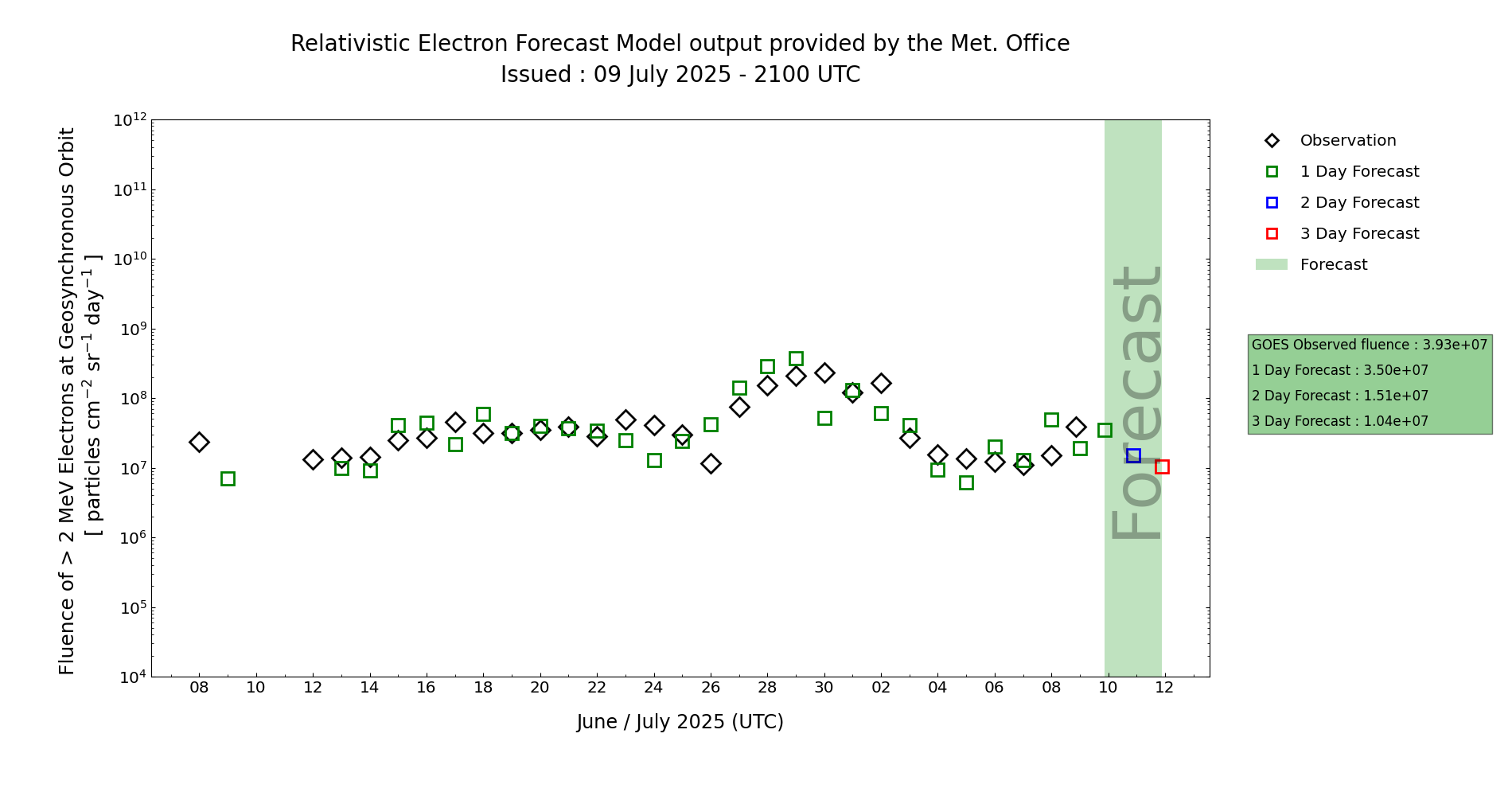 Electron fluence is below the Active threshold (1e8 integrated pfu) and is expected to remain below this level throughout the forecast period, on a flat or slightly rising trend. Forecast confidence decreases around Days 2 and 3 due to possible short-term flux increases, which is reflected in the forecast probabilities. MOSWOC REFMs forecast is currently verifying poorly, with Recurrence perhaps offering a more reliable guide.