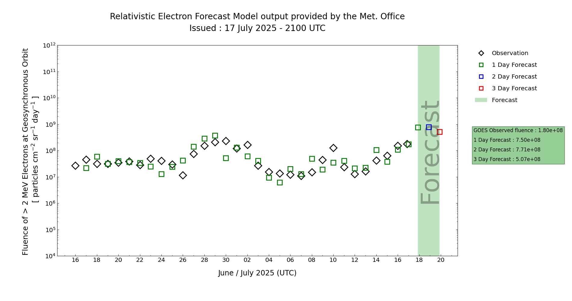 The Electron Fluence is currently Active, following on from persistent High flux over the last 24 hours. It is expected that this will be maintained throughout days 1 and 2 (17/18 Jul). Confidence then reduces from day 3 (19 Jul) onwards, perhaps most likely staying above the Active threshold with no significant geomagnetic activity forecast within that period. The daily upward trend observed in MOSWOC REFM is deemed to be good guidance.