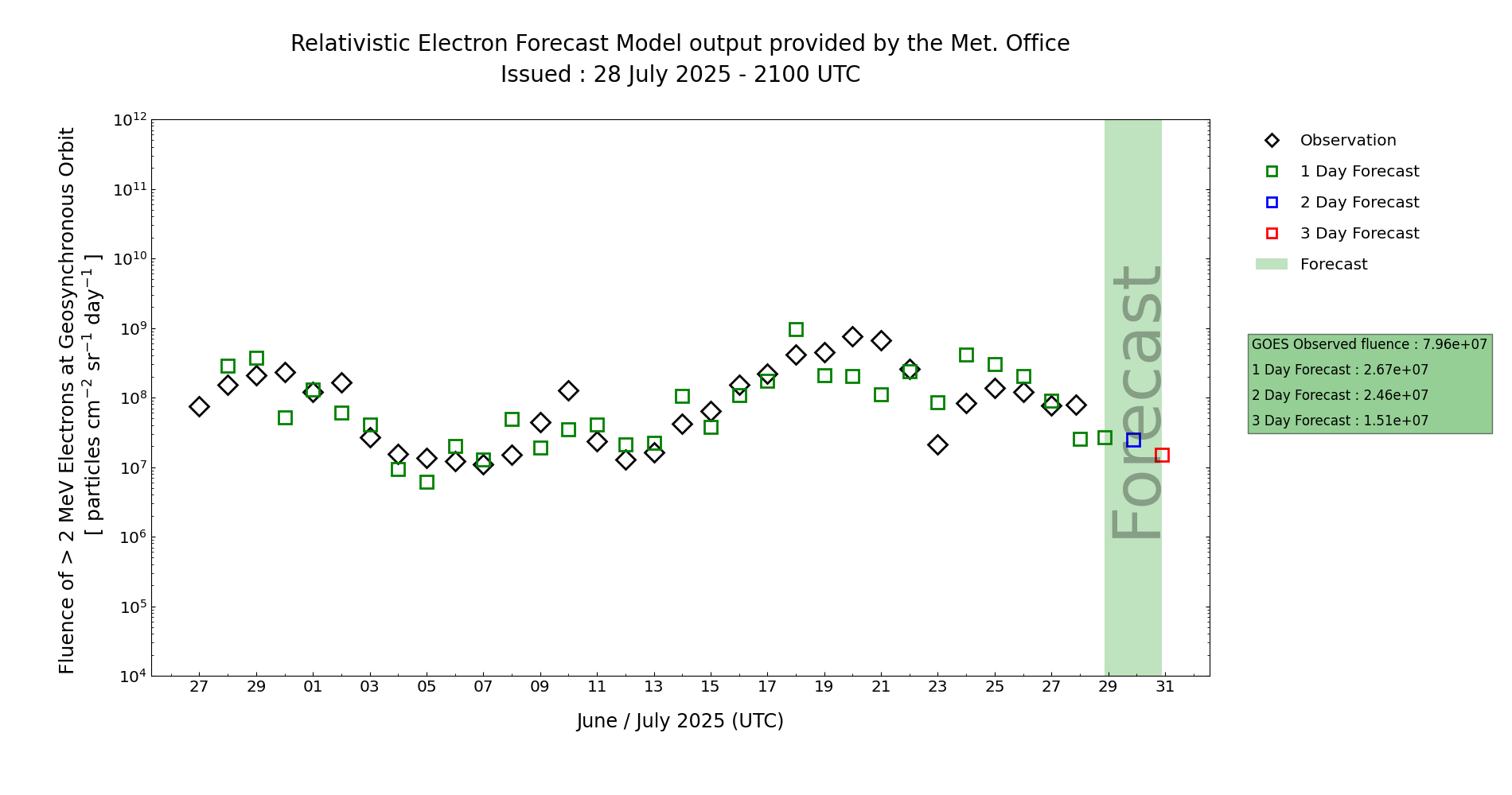 High energy electron flux levels at GEO have been at Moderate to High levels in the past 24 hours, peaking 1690pfu at 27/1655UTC. Similar levels are expected on Day 1 (28 July), with a likely drop in flux levels to follow Days 2 and 3 (29 and 30 July) due to the probable influence of CH67/-. Flux levels may begin to recover again by the end of the period but this is low confidence.