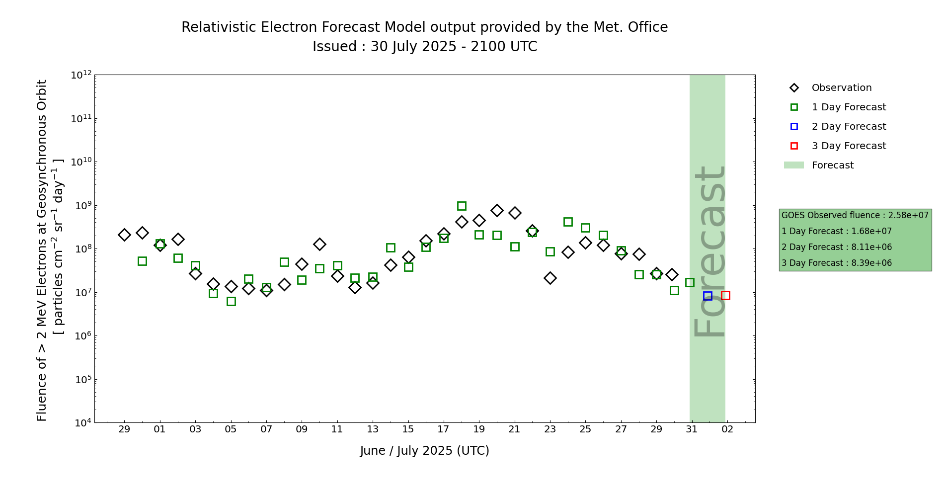 High energy electron flux at GEO is expected to be Normal to Moderate. It is possible that the Electron flux will increase slightly on day 3 or 4 (1-2 Aug) as the Van Allen belt relaxes and expands back towards GEO after any enhancement from the high speed stream day 2 (31 Jul). However, any High levels are likely to be brief, and only occurring at diurnal maximum. The corresponding electron fluence is on a declining trend and is currently below the Active (1e8 integrated flux) threshold. It is possible fluence may increase on day 3 or 4 (1-2 Aug) but the most likely scenario is that fluence will remain below the Active threshold throughout the period.