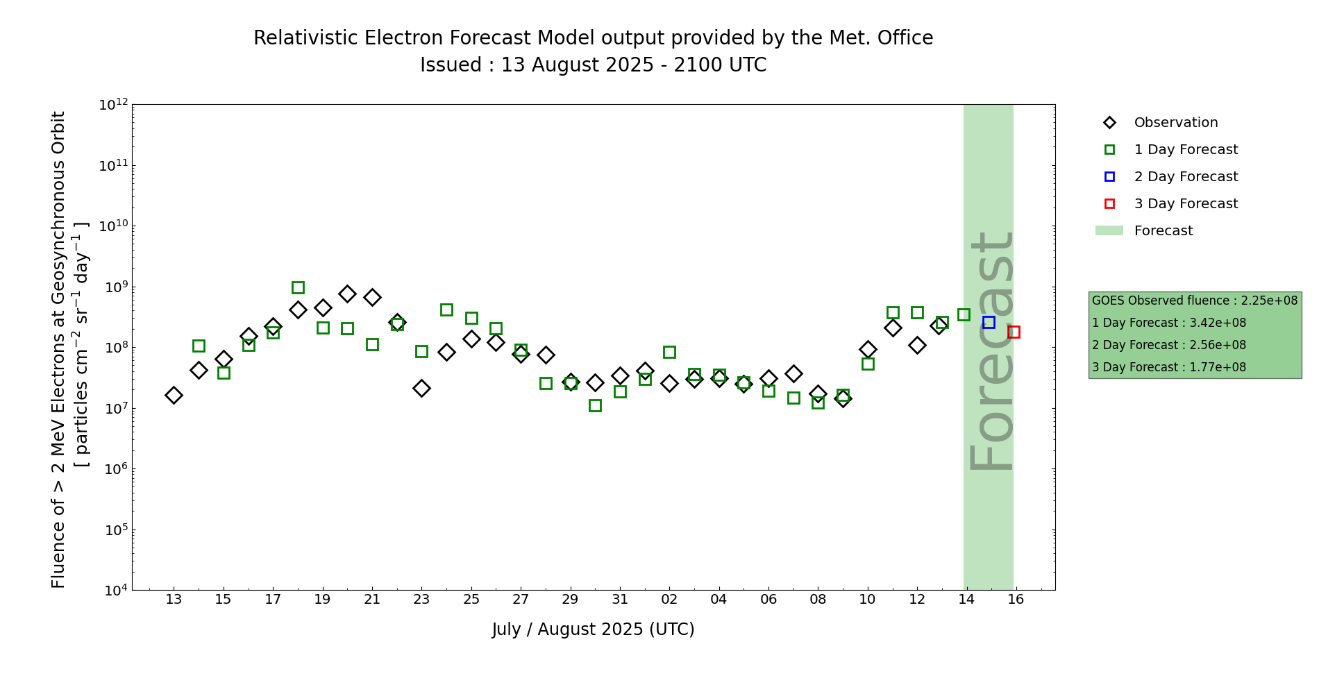 The associated fluence is currently Active, with a gradual build expected day 1-2 (13-14 Aug), before easing again days 2-3 (15-16 Aug). However, Active fluence likely to persist through the period. This is supported by both REFM and 27-day recurrence.