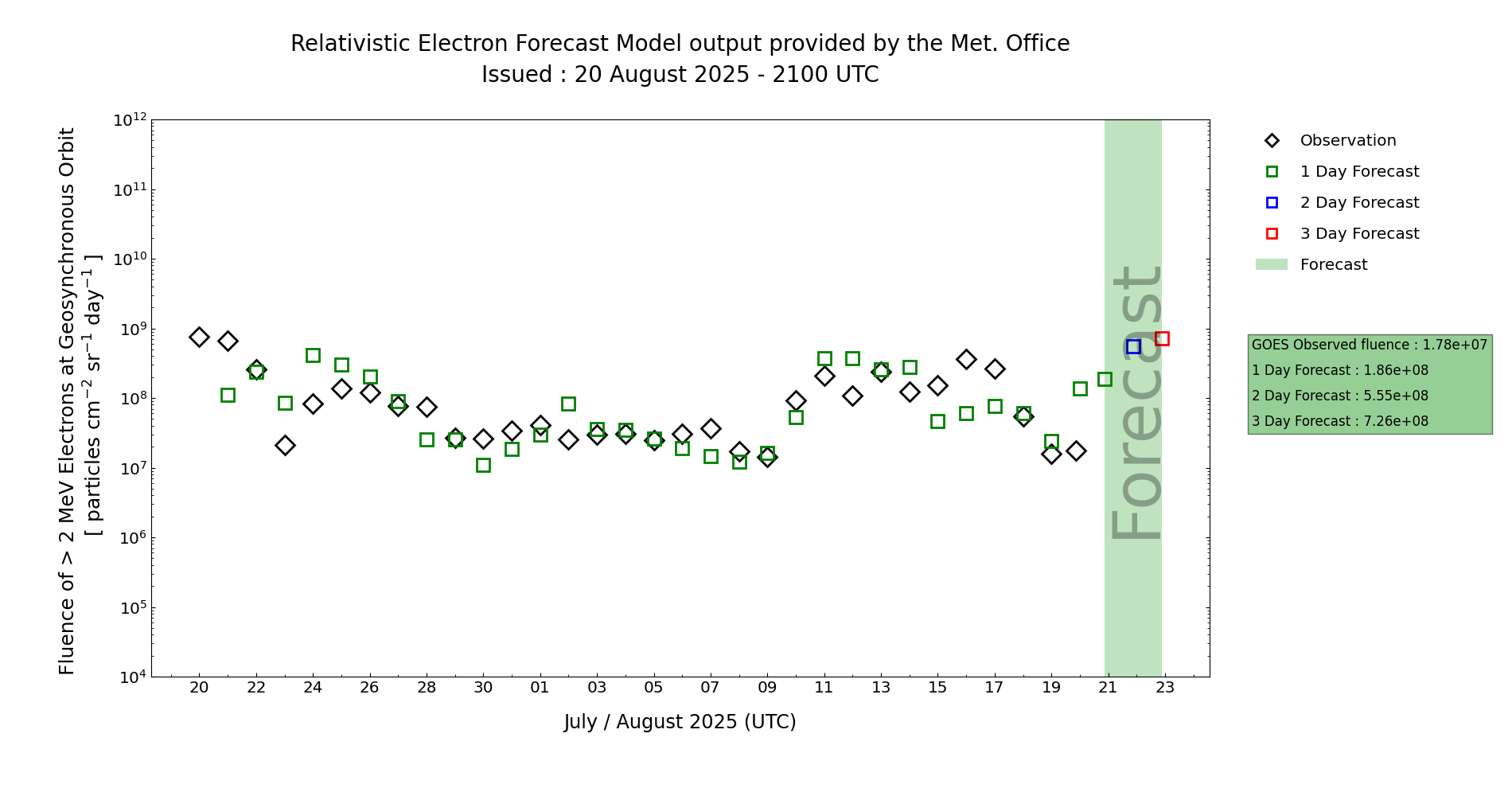 Fluence levels are expected to remain below the Active (1e8 integrated pfu) level on Day 1 and 2 (20 and 21 Aug) but increases to a strong chance of exceeding this threshold on Days 3 and 4 (22 and 23 Aug). MOSWOC REFM has slightly overestimated electron fluence in the past day or so, but the rising trend indicated later in the period is considered good guidance.