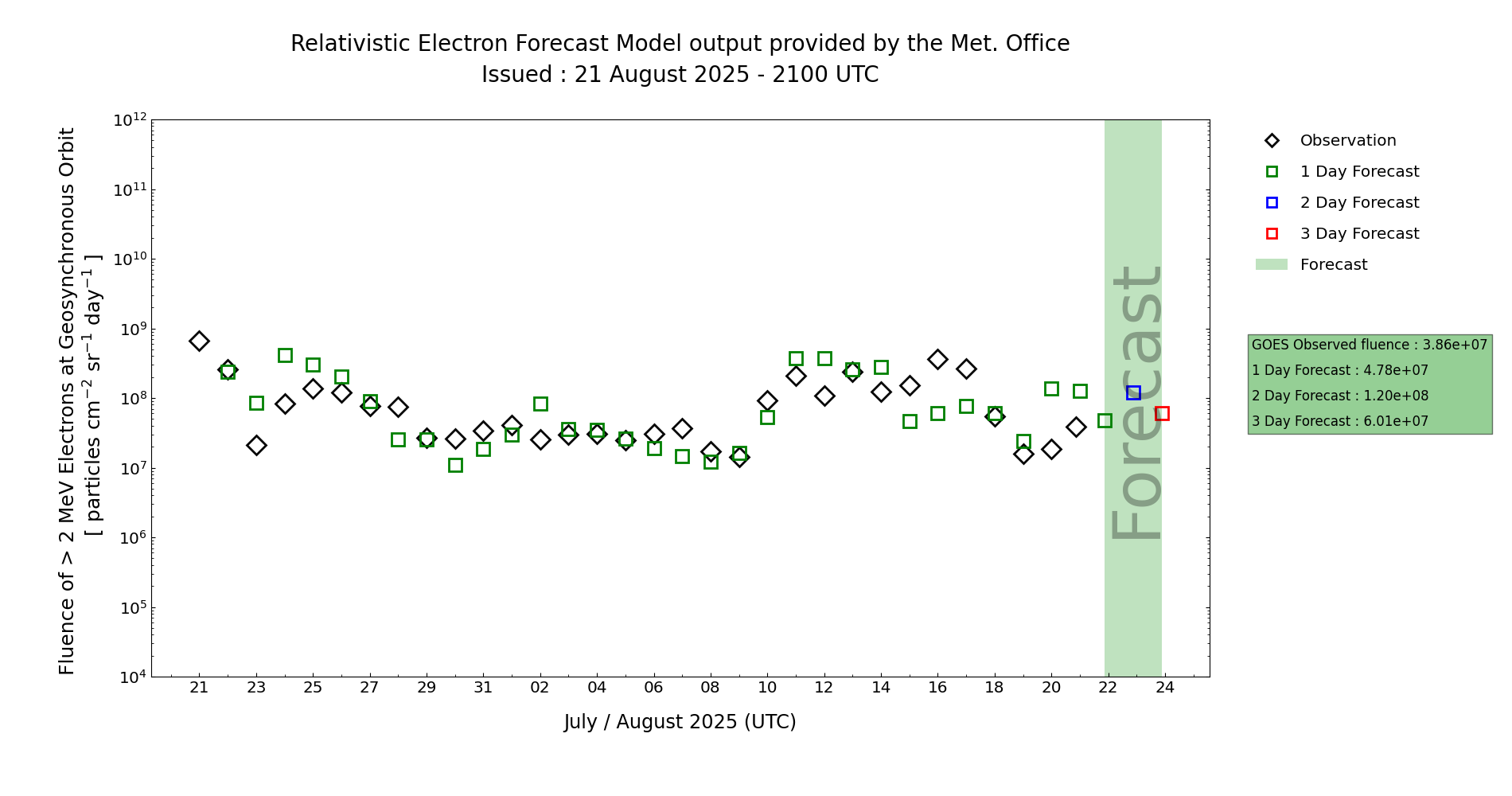 Fluence levels below the Active (1e8 integrated pfu) level on Day 1 (21 Aug) increases with a chance of exceeding this threshold on Days 2, 3 and 4 (22 to 24 Aug). MOSWOC REFM continues to overestimate the timing of electron fluence enhancement, but the rising trend indicated through the period is considered good guidance.