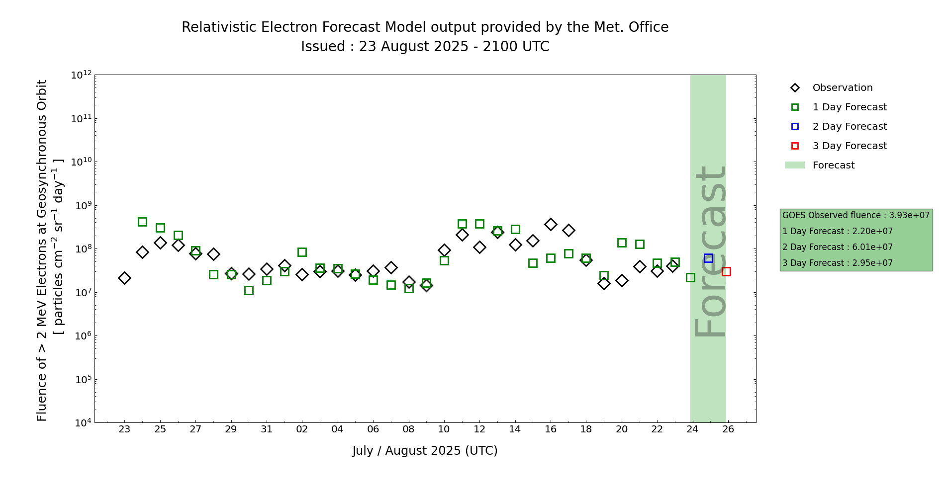 GOES high energy (>2MeV) electron flux has been at predominantly moderate levels, as it has recently been suppressed by influence of the HSS from CH72/-. A resurgence in electron flux is likely during this guidance period as the HSS effects wane and the radiation belt relaxes back towards GEO. Based on recurrence, diurnally high flux levels are considered likely, particularly from Day 1 (23 Aug) onwards.