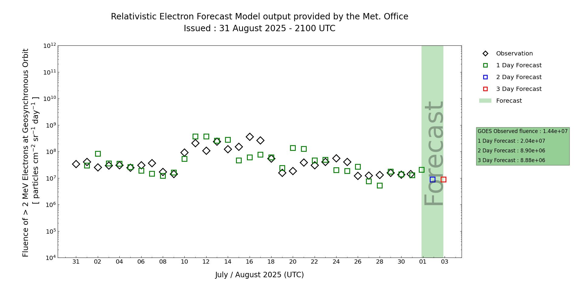 High energy (>2MeV) electron flux as observed by GOES19 remains at mostly Moderate levels, and is expected to persist near this level early in the period, likely getting 'knocked down' to mainly background levels following the arrival of the CME from 30 Aug, estimated Day 2 or 3 (01 or 02 Sept).