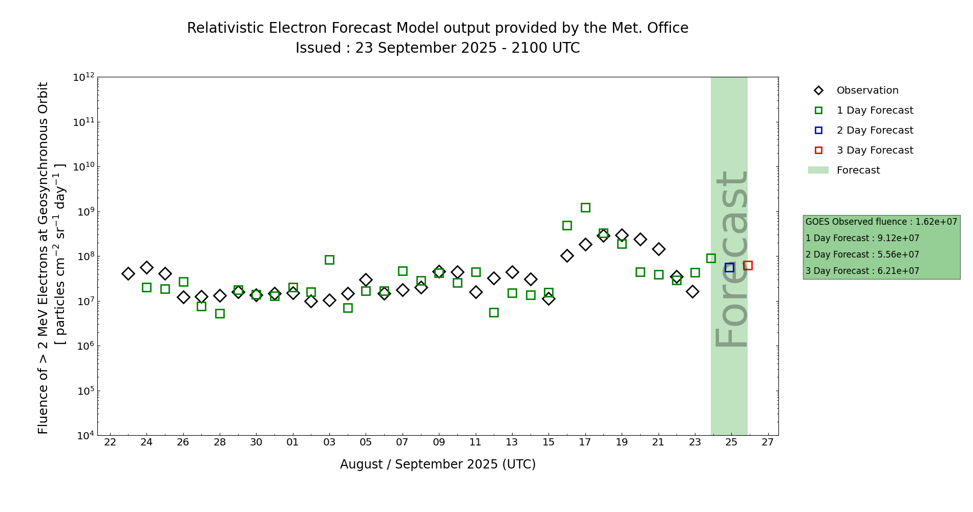 The associated 24 hour electron fluence was Active at first on day 1 (22 Sep), but fell below the active level later in the day. An increasing trend is forecast by Day 2-3 (24-25 Sep), this will bring a chance of reaching Active (1e8) by the end of day 3 (25 Sep) and into Day 4 (26 Sep). This is supported by MOSWOC REFM and 27-day recurrence which both suggest fluence will persist well below this level.