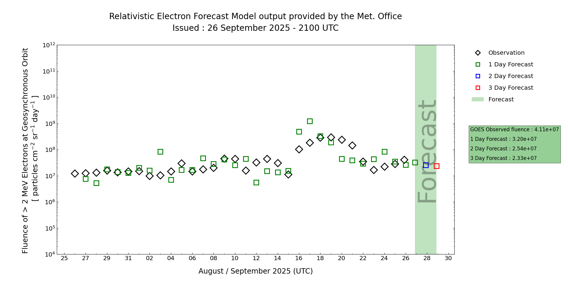 The associated 24 hour fluence is forecast to persist below the Active level (1e8 integrated pfu), with a steady or slightly increasing trend. This is supported by MOSWOC REFM, which is currently running above observed value, although fluence is expected to remain slightly above the 27-day recurrence level, as the recent fast wind enhancement was barely observed on the previous rotation.