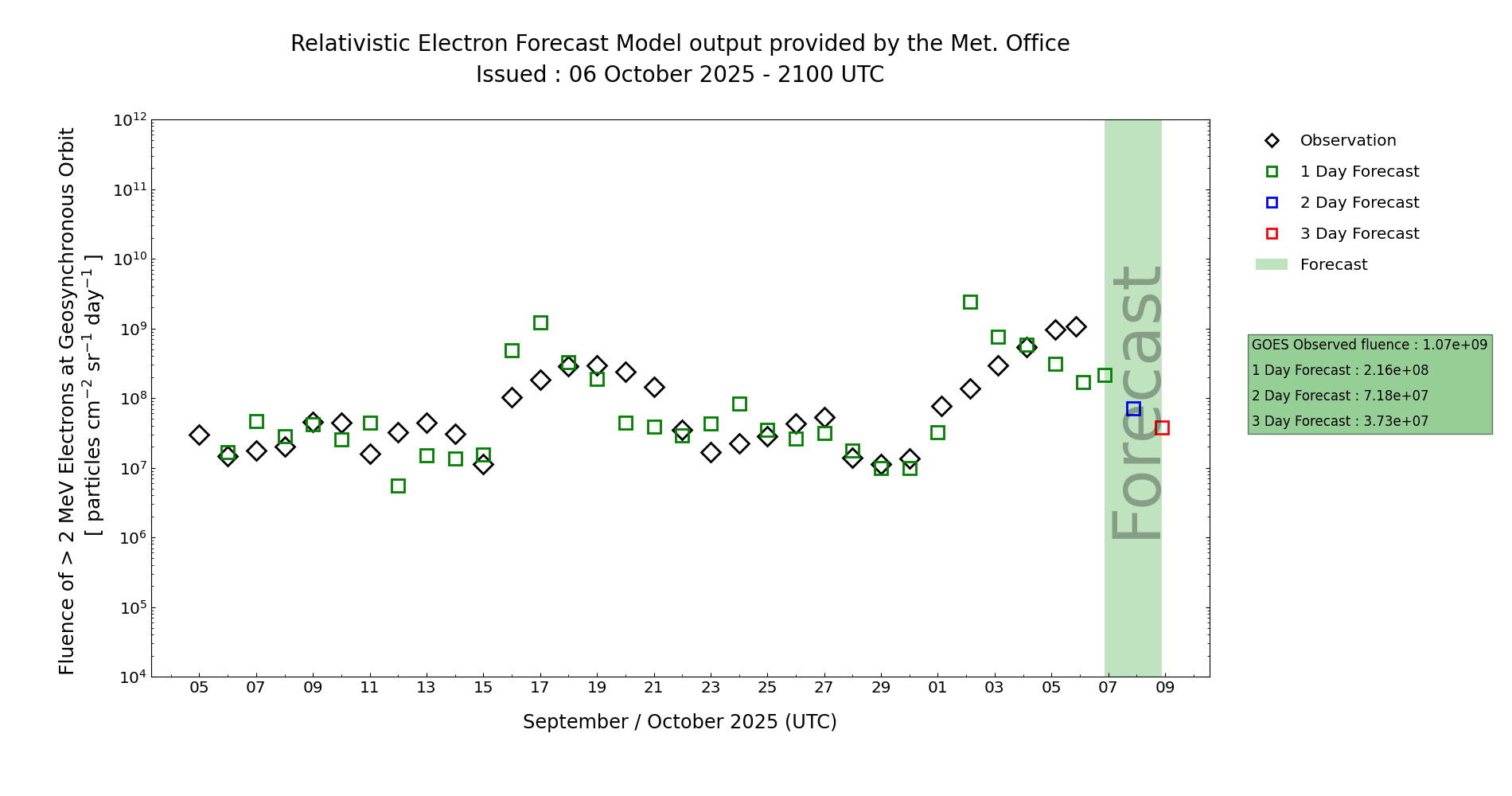 The associated 24 hour fluence is expected to persist at the Active level over the coming days. The MOSWOC REFM model supports this, although the model is currently overestimating the fluence and is considered to be overestimating the forecast peak fluence. Conversely 27-day recurrence is not useful due to the very different solar wind environment on this rotation. A probable reduction in the fluence is likely Days 2-4 (06-08 Oct) due to a potential CME arrival, although this is low confidence.