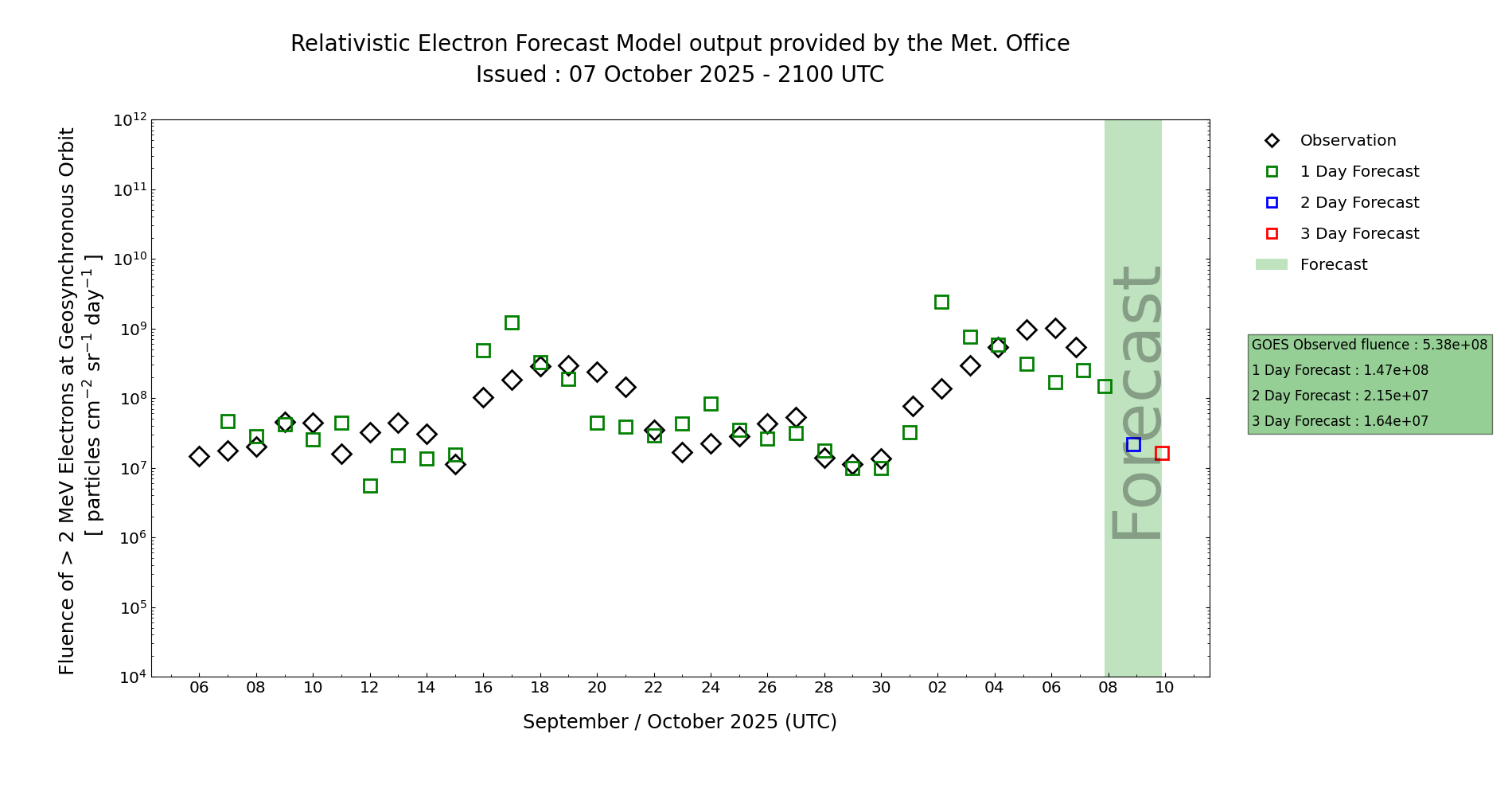 GOES-19 >2MeV electron flux has persisted High after the recent notable connection to the fast winds CH83 and CH84. However, the persistence of these levels is low confidence with the potential for up to two CME arrivals on days 1-2 (-7-08 Oct), which could result in flux dropping out, with any subsequent recovery low confidence. However it is likely that High flux will continue at periods of diurnal maximum day 3-4 (09-10 Oct), and may continue throughout if only minimal arrivals are observed.