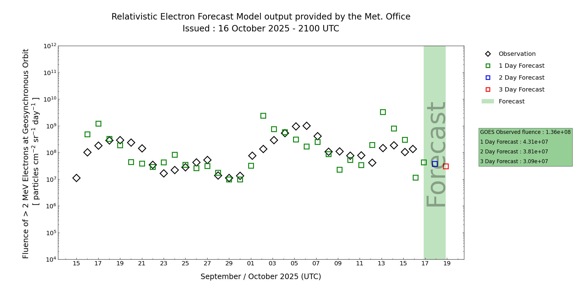 The associated 24 hours electron fluence is currently above the Active threshold, although on a declining trend. Given the potential for various CMEs through the period the confidence lowers significantly for Active fluence conditions. MOSWOC REFM output shows a marked decline in Active fluence, although this isn't quite trusted, a declining trend is forecast due to any significant geomagnetic activity through day 1 (16 oct) knocking the electrons away from GEO. On the contrary, the reoccurrence model, is believed to be too High.