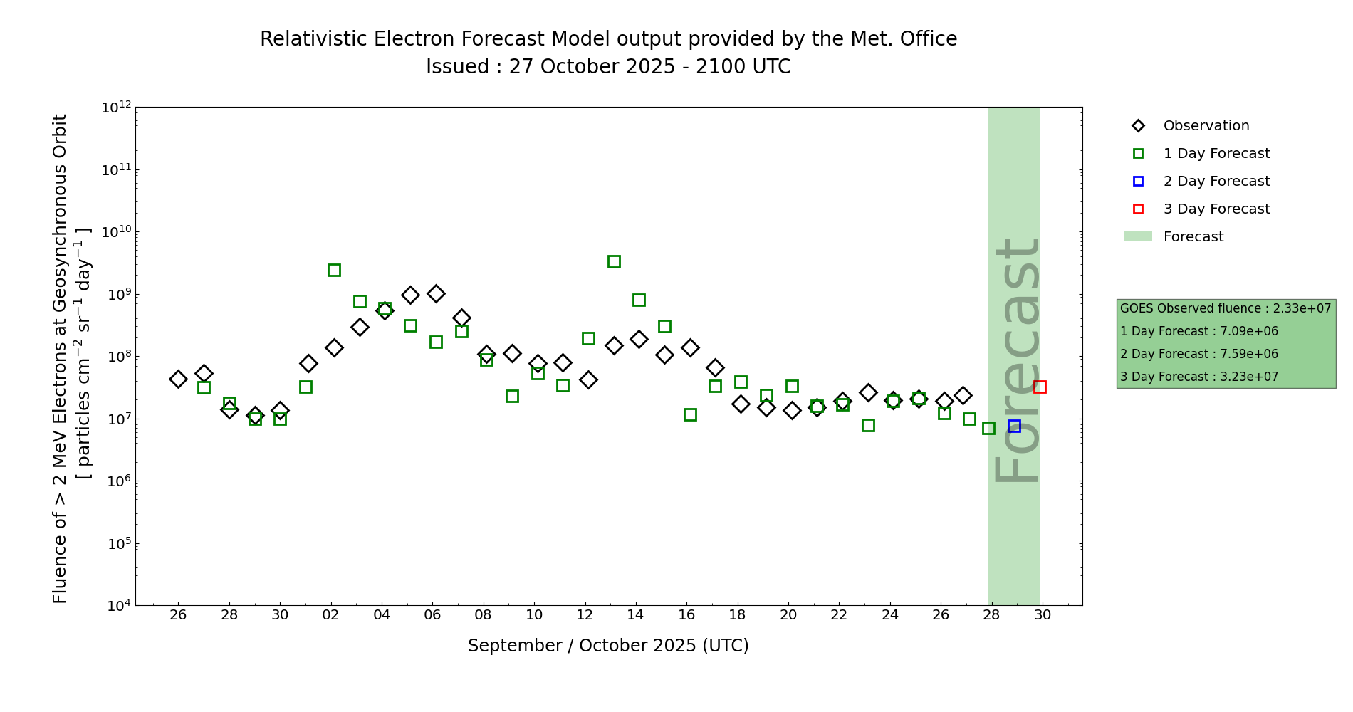 GOES19 >10MeV electron flux has been at mostly moderate levels, and is likely to see a drop out to mainly background levels from any CME arrival on day 1 (26 Oct), and any subsequent fast wind enhancement days 2-3 (27-28 Oct). While this may charge the Van Allen Belt, any subsequent rise in observed flux at GEO is most likely to occur either late day 3 or day 4 (28-29 Oct).