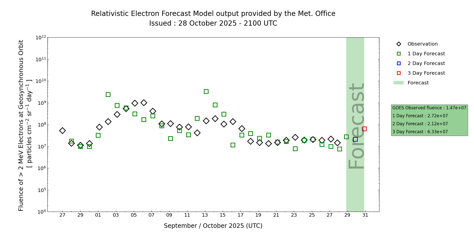 GOES19 >10MeV electron flux has been at mostly moderate levels, and is likely to see a drop out to mainly background levels from any CME arrival on day 1 (26 Oct), and any subsequent fast wind enhancement days 2-3 (27-28 Oct). While this may charge the Van Allen Belt, any subsequent rise in observed flux at GEO is most likely to occur either late day 3 or day 4 (28-29 Oct).