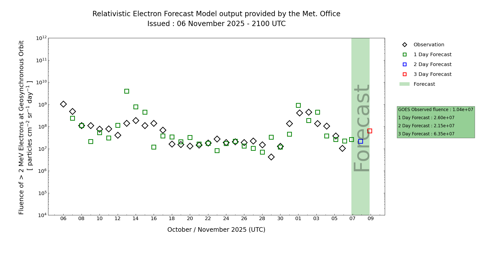 The associated 24hr Fluence is now showing a flat trend around the Active (1e8 integrated pfu) threshold. A declining trend is expected by Days 2 and 3 (06 and 07 Nov). This trend is supported by MOSWOC REFM output, which is considered reasonable guidance.