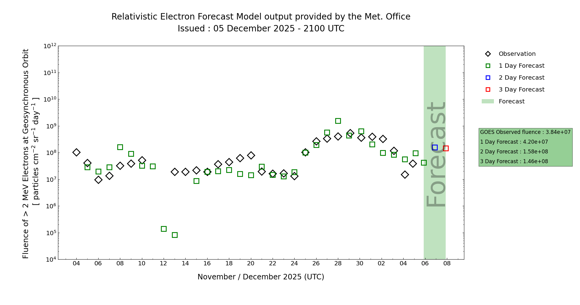 GOES19 >2 MeV electron flux was previously High until the arrival of the combination of the X1 flare CME and fats winds of coronal hole 04, sharply dropping to Moderate to Background from 03/1845UTC. Similar conditions are expected initially, with electron flux remaining Moderate to Background. As the fast winds of coronal 04 give way to weaker fast winds of coronal hole 05 around day 3 (06 Dec) electron flux may once again begin to rise to diurnally High after the subsequent charging from coronal hole fast winds and relaxation of the Van Allen belts.