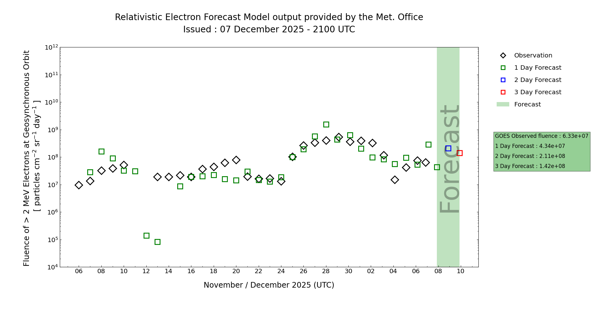 The associated electron fluence is currently below Active, but on a rising trend, with a Chance of reaching Active by the end of Day 1 (06 Dec), then becoming a likelihood through Day 2 (07 Dec). REFM guidance supports this outlook, showing a continued upward daily trend that exceeds Active levels later in the period. Recurrence is not a reliable indicator at present due to the numerous CME arrivals observed during the previous 27-day rotation.