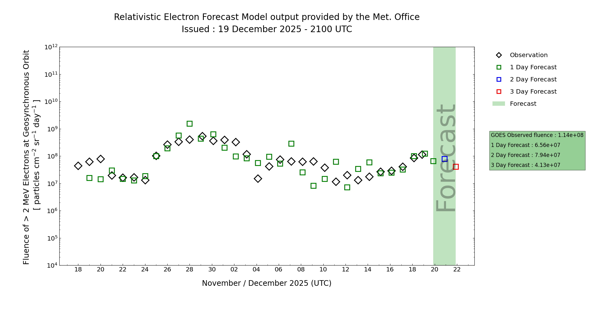 Associated Electron Fluence levels are expected to gradually rise with an increasing Likelihood of reaching the Active threshold through days 1 to 3 (19 to 21 Dec), however confidence lowers by day 4 (22 Dec) with the anticipated arrival of the next coronal hole fast wind.