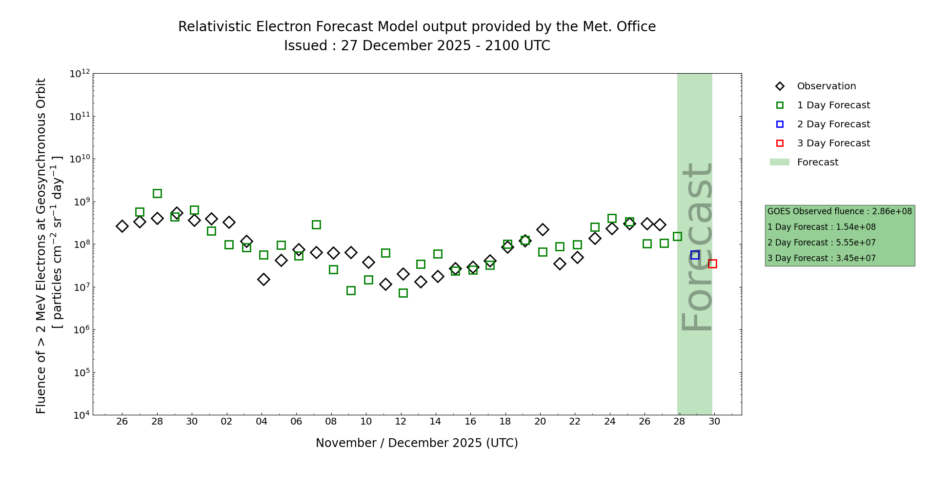 There are no signs of likely mechanisms to reduce electron counts at GEO in the period as geomagnetism from the current fast wind wanes, and Active fluence is therefore Expected throughout. The diurnal oscillation in electron flux has risen day on day into the Christmas period, and this will most likely continue. There is therefore an sustained risk of persistent periods of High and a chance of Very High.
