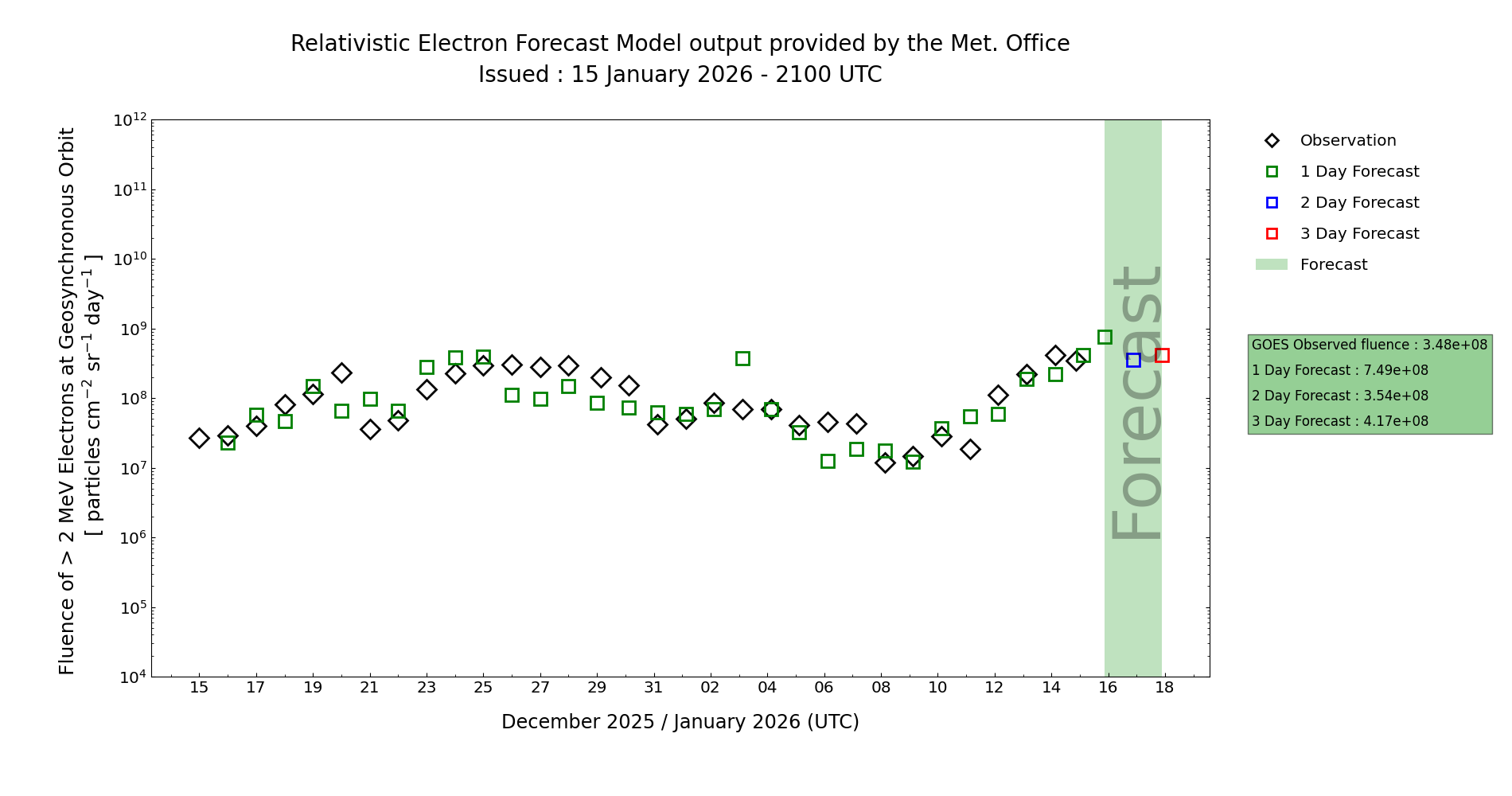 The associated 24-hour fluence is above the Active (1e8 integrated pfu) threshold and continues on a gradual rising trend. It seems probable that fluence levels will remain above Active for much of this period, likely reducing from later on Day 3 (17 Jan) as the next HSS arrives. MOSWOC REFM is broadly supporting this general trend, although the values for Days 1 and 2 (15-16 Jan) may be on the low side.