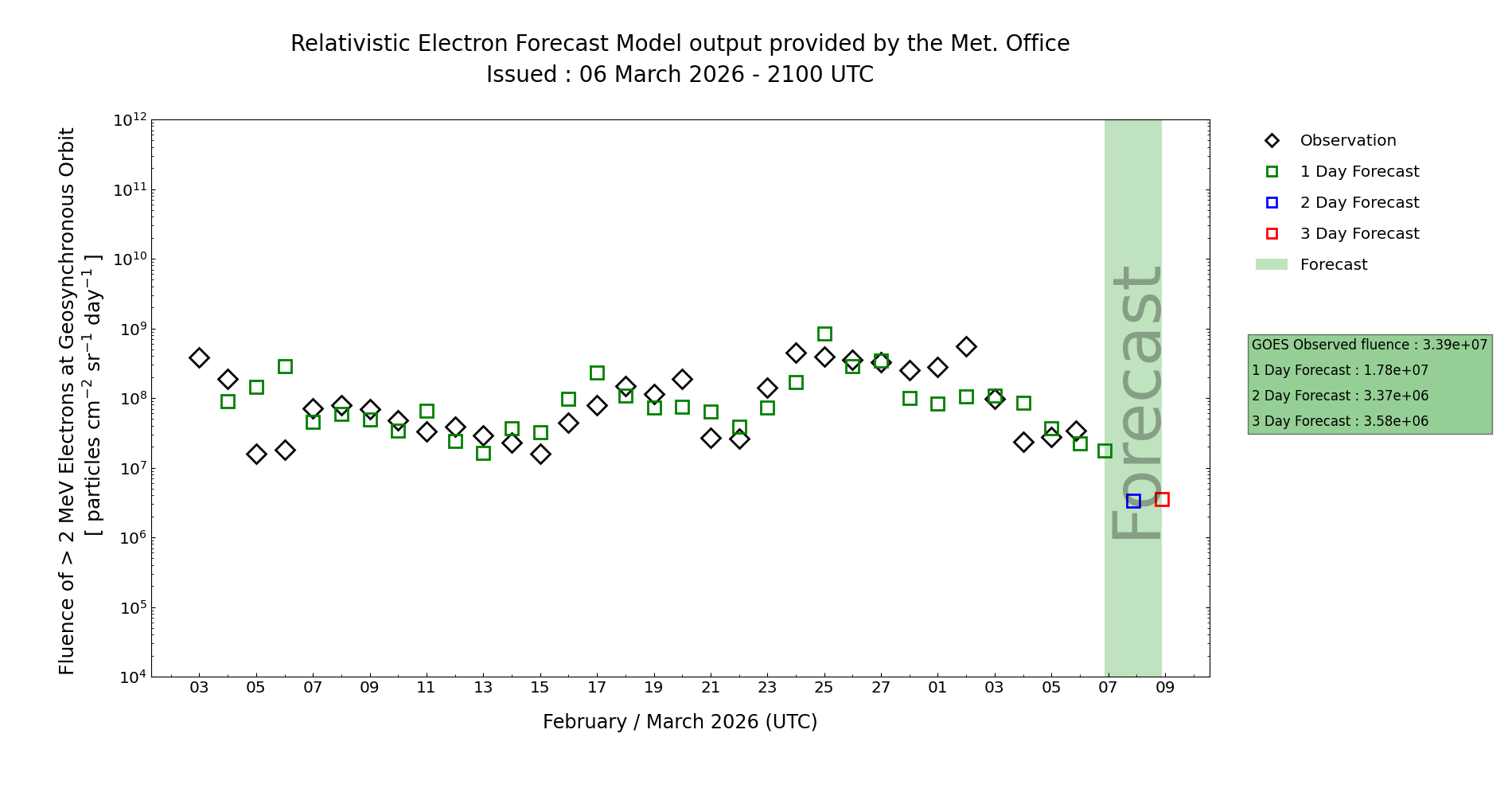 The associated 24 fluence is now expected to remain below the Active threshold, but with a rising trend likely days 1-2 (05-06 Mar). MOSWOC REFM is currently providing poor guidance for the current observed electron fluence, and suggests an overall declining trend in the next couple of days.