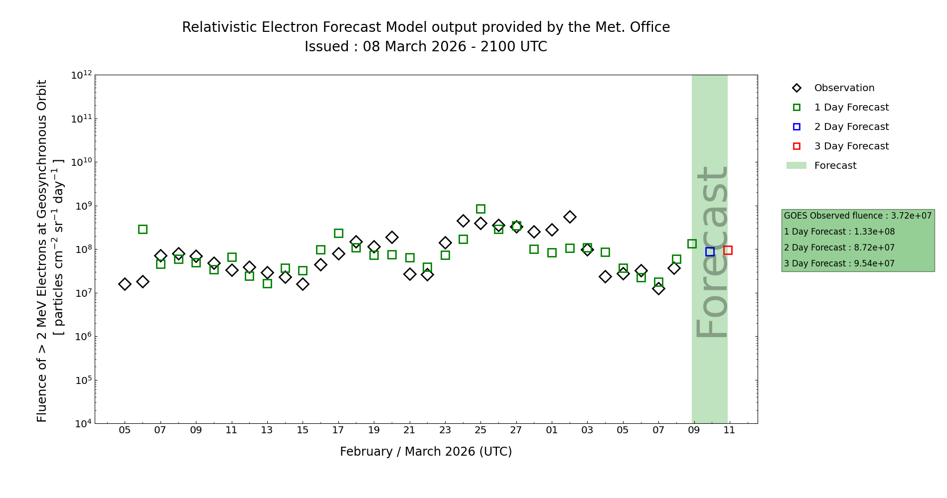 The associated 24 hr electron fluence is expected remaining below the Active threshold (1e8 integrated flux), but with a rising trend in this guidance period. MOSWOC REFM appears to be providing sensible guidance for the observed electron fluence, with an increase indicated on later on Day 1 (08 Mar) which may be too early by around 24 hours.